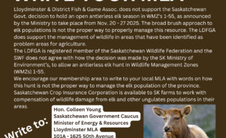 Antlerless Elk Season Nov. 20-27, 2025 Lloydminster & District Fish & Game Association (LDFGA) does not support the Saskatchewan Government decision to hold an open antlerless elk season in WMZ’s 1-55, as announced by the Ministry to take place from November 20 -27, 2025. The broad brush approach to elk populations is not the proper…
