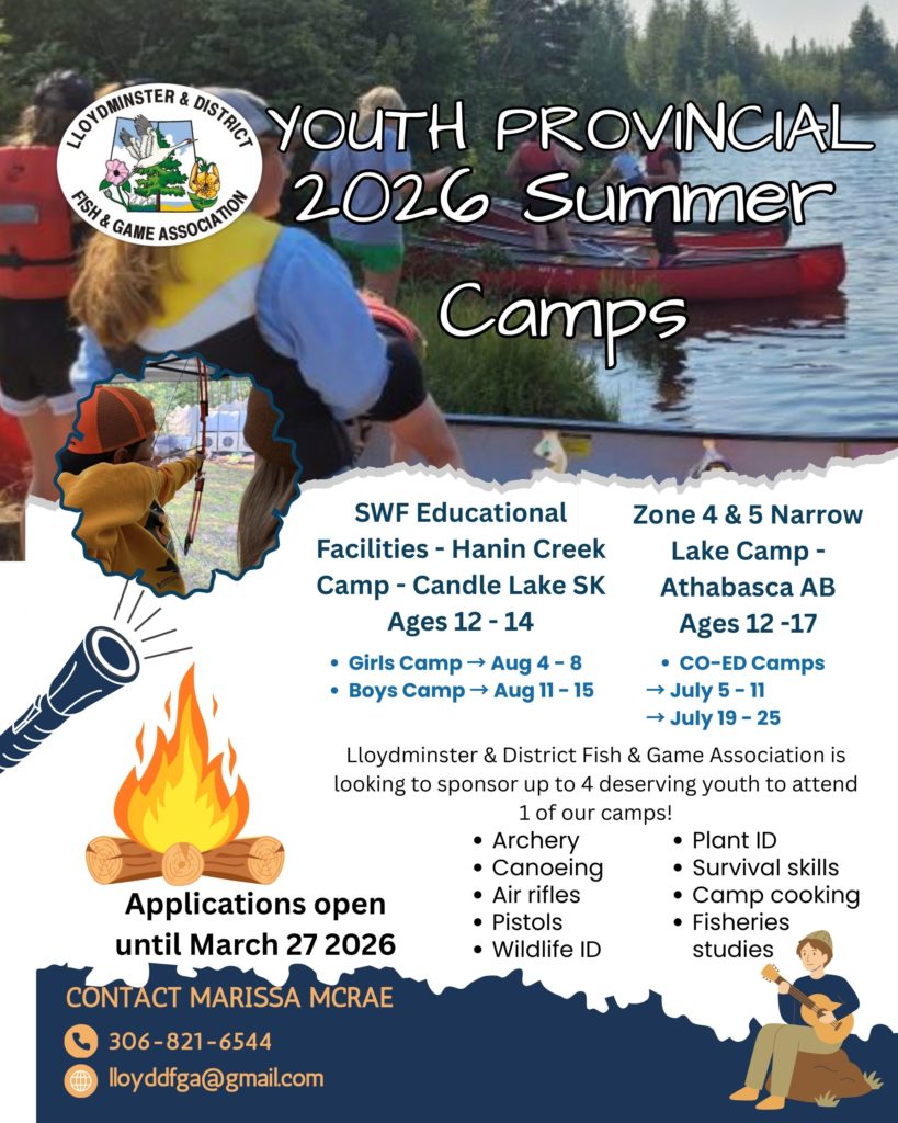 The Lloydminster & District Fish & Game Association has been sponsoring youth to attend both the Alberta (Zone 4 & 5 Narrow Lake Camp) and Saskatchewan (SWF Educational Facilities – Candle Lake) Conservation Youth Camps for over 30 years. In order to be sponsored by the Lloydminster & District Fish and Game, you must send your application to Larry Chambers at larrygeochambers@gmail.com.